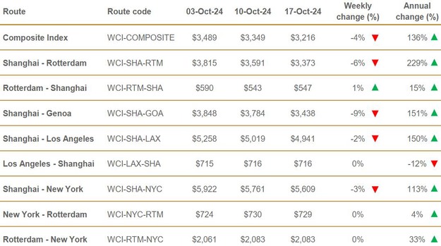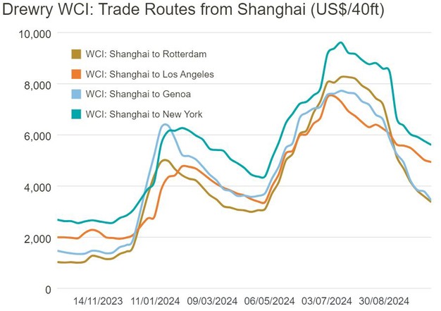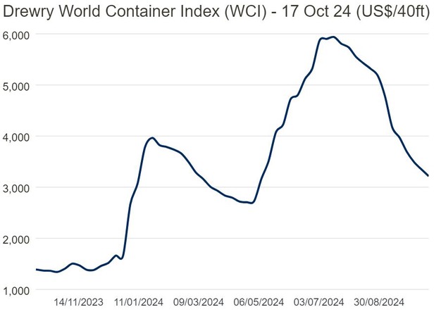 Op 17 oktober 2024 bedraagt de Drewry WCI-composietindex $3.216 per 40ft container. Dit cijfer ligt 69% onder het vorige piekniveau tijdens de pandemie van $10.377 in september 2021. In vergelijking met het gemiddelde tarief in 2019, dat vóór de pandemie $1.420 bedroeg, is het huidige tarief echter 126% hoger.
