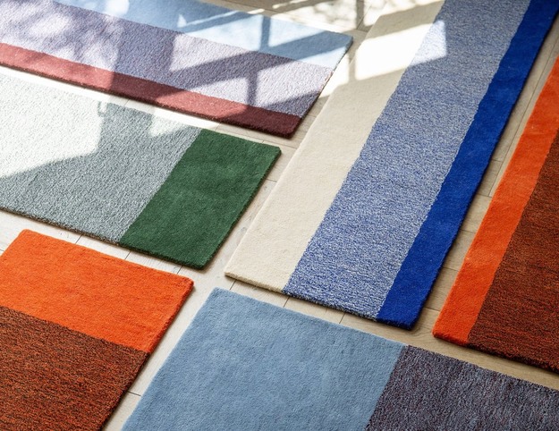 De wollen vloerkleden zijn verkrijgbaar in vier opvallende kleurstellingen: cobalt blue & ecru, green & lilac, poppy orange & brown en sky blue & bordeaux. Elke combinatie bestaat uit drie kleuren, waarbij de twee statement kleuren aan de buitenzijden tot een derde kleur samensmelten in het middelste vlak. De kleurencombinaties van de vloerkleden liggen in lijn met de kleuren in de bedtextielcollectie en combineren daardoor uitstekend. Elke kleurencombinatie is verkrijgbaar in twee patronen: met verticale of horizontale strepen.