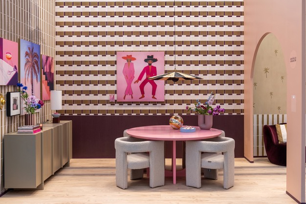 De Palm Springs-collectie bevat een breed scala aan patronen en prints, van tropische palmbomen tot art-deco tegelpatronen. Voor wie wat elegantie wil toevoegen, biedt de collectie ook behang met een lambriseringseffect. ,,Dit behang creëert de uitstraling van klassieke panelen zonder dat er getimmerd of geverfd hoeft te worden," licht Sofie de Kruijff (co-founder van The Home Style Club) toe.
