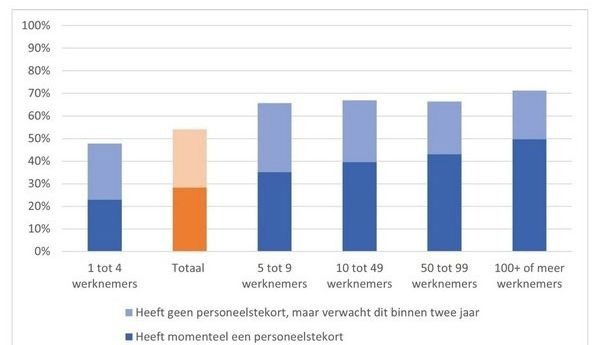 Uit het onderzoek blijkt dat grotere organisaties vaker te maken hebben met actuele personeelstekorten, terwijl de kleinere vaker verwachten in de toekomst tekorten te krijgen. Bij organisaties met 1-4 werknemers ervaart 23% momenteel een tekort en verwacht nog eens 25% binnen twee jaar een tekort. Daarentegen heeft 50% van de grote organisaties (met 100 werknemers of meer) op dit moment een tekort, waarbij nog eens 21% er nu geen last van heeft, maar verwacht dat dit binnen twee jaar wel zo zal zijn.