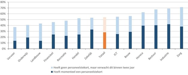 In alle sectoren is er een personeelstekort en verwachten ook veel werkgevers in de toekomst een tekort. Het actuele tekort varieert tussen 14% in de vervoerssector en landbouw en 42% in de industrie. Naast de industrie rapporteren werkgevers in de horeca, zorg en het openbaar bestuur het vaakst een personeelstekort, met ongeveer 40% van de werkgevers die momenteel een tekort ervaren. Het percentage werkgevers dat binnen twee jaar een tekort verwacht, verschilt minder tussen sectoren en ligt overal tussen de 20 en 33%.