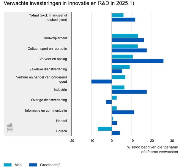 Per saldo verwachten ondernemers in zowel het mkb als in het grootbedrijf in 2025 een toename van hun investeringen in innovatie en R&D. Met een saldo van bijna 12 procent zijn die verwachtingen in het grootbedrijf positiever dan in het mkb (6 procent). In het mkb zijn ondernemers in de bouwnijverheid en de cultuur, sport en recreatie het meest positief gestemd over de investeringsverwachtingen voor innovatie en R&D. Alleen mkb-bedrijven in de horeca verwachten hierin minder te investeren. Bij de meeste bedrijfstakken zijn de verwachtingen in het grootbedrijf positiever dan in het mkb. In het grootbedrijf zijn de verwachtingen het meest positief in de vervoer en opslag.