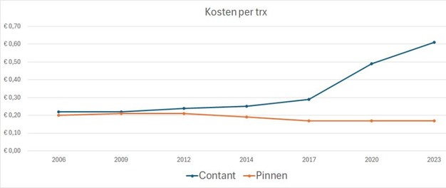 De verschillen in kosten voor cash betalingen tussen branches van toonbankinstellingen zijn in diezelfde periode ook verder opgelopen. Een horeca-ondernemer betaalde in 2017 ruwweg twee keer zoveel voor een contante betaling (€0,47) als een detailhandelaar (€0,24). In 2023 is dat verschil opgelopen tot bijna drie keer zoveel (€1,36 in de horeca en €0,50 in de detailhandel). Dat is mede het gevolg van een betrekkelijk efficiënte afhandeling van contant geld in de detailhandel.