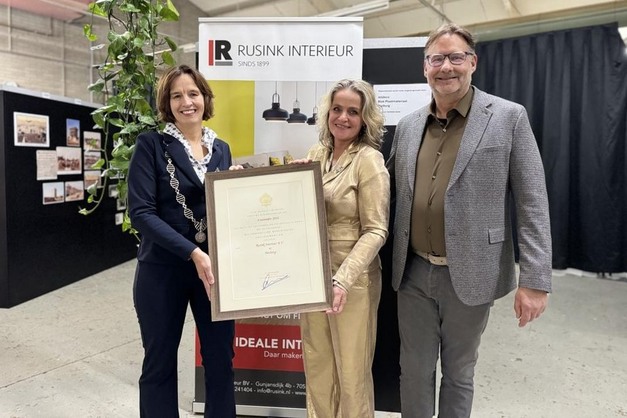 Vrijdagmiddag 15 november 2024 reikte burgemeester Mirjam Maasdam het predicaat Hofleverancier uit aan Rusink Interieur in Heelweg tijdens het jubileumfeest van het 125-jarige bedrijf.