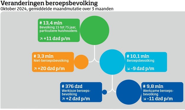 In oktober 2024 waren er bijna 9,8 miljoen mensen van 15 tot 75 jaar met betaald werk. Dit aantal is in de afgelopen drie maanden met gemiddeld 11 duizend per maand gedaald. Het percentage werkenden kwam hiermee in oktober uit op 72,8. Drie maanden eerder was dit nog 73,3 procent. De werkloosheid bleef in oktober vrijwel gelijk. Er waren 376 duizend werklozen, dat is net als in september 3,7 procent van de beroepsbevolking. Dit meldt het CBS op basis van nieuwe cijfers. UWV registreerde eind oktober 179 duizend lopende WW-uitkeringen.