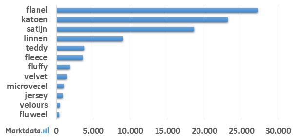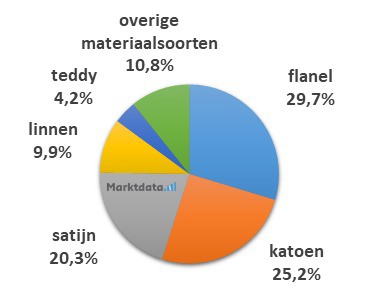 Bijna 30 procent van het zoekvolume met materiaalsoortaanduiding heeft betrekking op flanel. Op de tweede plaats staat katoen met een aandeel van 25,2 procent in het zoekvolume. De nummer drie is satijn, welke ruim 20 procent van het zoekvolume vertegenwoordigt.