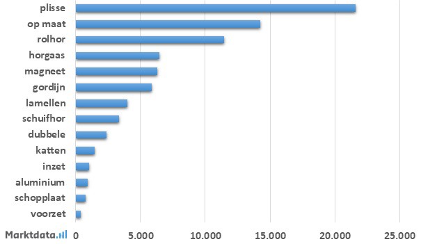 Het productkenmerk met veruit het meeste zoekvolume is plisse. In de afgelopen vier jaar werd er ruim 21.000 keer per maand in de Googlezoekmachine in Nederland gezocht met de term "plisse" in de zoekopdracht in relatie tot horren en hordeuren. De term "op maat" behaalde per maand gemiddeld ruim 14.000 zoekopdrachten.