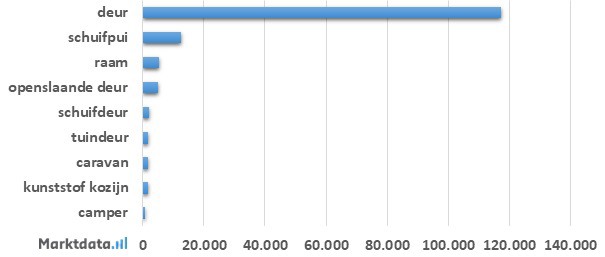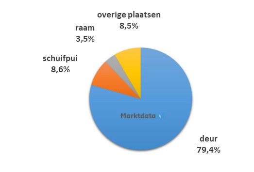 Bijna 80 procent van het zoekvolume met aanduiding van de montageplaats heeft betrekking op de deur. Op de tweede plaats staat de schuifpui met een aandeel van 8,6 procent in het zoekvolume. De nummer drie is het raam, die 3,5 procent van het zoekvolume vertegenwoordigt.