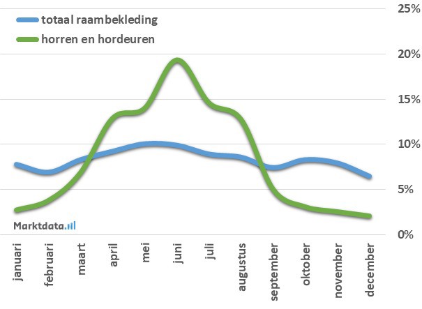 Het zoekvolume van de zoekopdrachten gerelateerd aan raambekleding over de afgelopen vier jaar is per maand geanalyseerd. Hierbij is gemeten hoe groot het zoekvolume-aandeel per maand is over de afgelopen vier jaar. Indien er iedere maand evenveel wordt gezocht, dus gelijkmatig over het hele jaar verdeeld, dan zou het maandelijkse aandeel in het zoekvolume 8,3% zijn (100%/12 maanden). Onderstaand figuur toont het aandeel van het jaarlijkse zoekvolume per maand van zoekopdrachten met de tekst "hor" er in over de afgelopen vier jaar. Daaruit valt af te lezen dat het zoekvolume een duidelijke piek heeft in het voorjaar en de zomer. In juni wordt er het meest gezocht naar horren en hordeuren. Deze maand vertegenwoordigt 19,4 procent van het jaarlijkse zoekvolume. In de maand december is het zoekvolume het geringst met een aandeel van slechts 2,1 procent. Ten opzichte van alle raambekleding gerelateerde zoekopdrachten zijn de zoekopdrachten op het gebied van horren en hordeuren sterk geconcentreerd in het insectenseizoen.