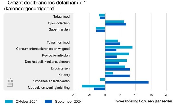 De omzet van de non-food (inclusief detailhandel niet-in-winkel) groeide in oktober 2024 met 4,2 procent. Het volume (de voor prijsveranderingen gecorrigeerde omzet) was 3,7 procent hoger dan een jaar eerder.