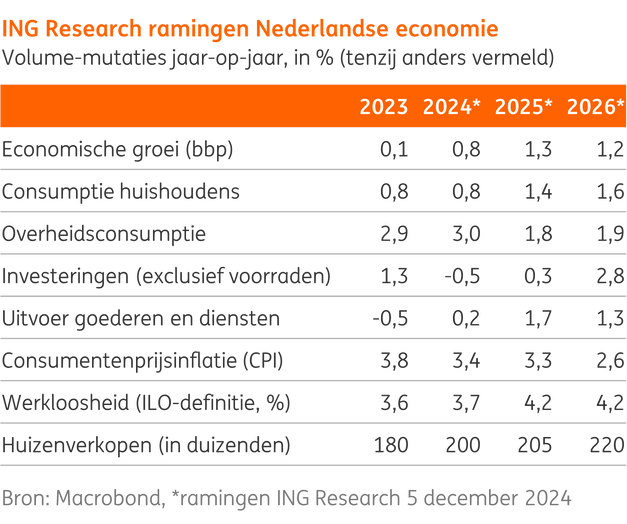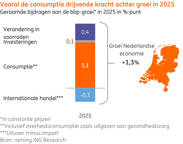 De Nederlandse economie groeit in 2025 naar verwachting van ING Research op het gematigde tempo van 1,3%. Dit volgt op een jaar van zwakke groei van 0,8%, waarin de economie aanvankelijk nog last had van de energiecrisis en van de terugloop van de wereldwijde goederenvraag. Het gros van de groei komt naar verwachting door binnenlandse vraag. Vooral van de consument, maar ook de overheid is één van de belangrijkste drijvende krachten daarin.
