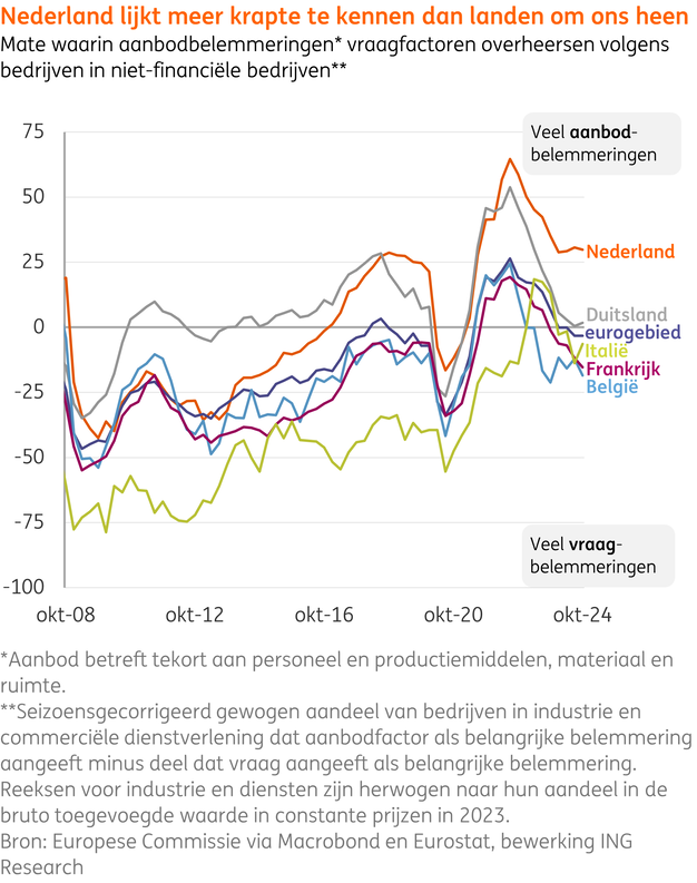 Zelfs na een periode waarin de economie meer dan een jaar krimp heeft laten zien, is de economische krapte op vele vlakken aangehouden. Het gebrek aan personeel blijft voorlopig de grootste belemmering voor bedrijven, terwijl bijvoorbeeld ook gebrek aan ruimte en aansluiting op het elektriciteitsnet factoren zijn die groei beperken. Meer dan in de landen om ons heen geven bedrijven in grote mate aan dat zulke aanbodproblemen en niet problemen met gebrek aan productvraag de grootste beperking voor verdere groei zijn.