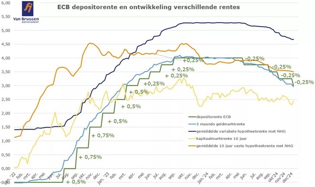 De renteverlaging door de ECB zorgt naar verwachting voor een daling van de variabele hypotheekrentes met 0,20% tot 0,25%. Vaste hypotheekrentes blijven voorlopig stabiel, met meer beweging verwacht in 2025. Dat meldt Van Bruggen Adviesgroep.
