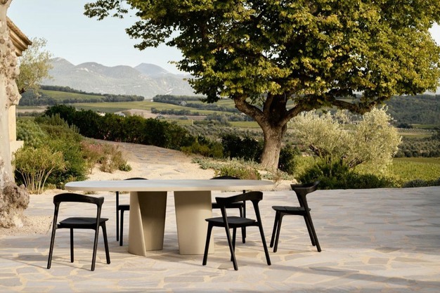 De collectie biedt ook slimme oplossingen voor buitengebruik, zoals de elegante Bok eettafel, gemaakt van massief teak en voorzien van een verfijnd groefpatroon, die moeiteloos plaats biedt aan 8 tot 12 mensen dankzij het uitschuifbare design. Voor wie een modern accent zoekt, brengt Ethnicraft met ontwerpen zoals de Roller Max eettafel en de Boomerang salontafel de veelzijdigheid van beton naar buiten. Met handmatige afwerkingen en een combinatie van gerecycled teak en weerbestendig beton voegen deze tafels een strakke, hedendaagse uitstraling toe aan elke buitenruimte, terwijl ze duurzaam en onderhoudsvriendelijk blijven.