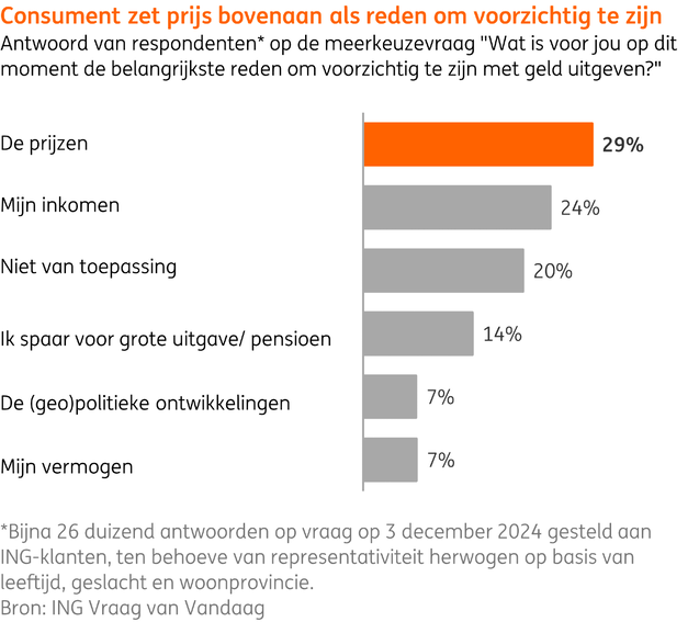 De combinatie van aanhoudend hoge inflatie, stijgende belastingen en structurele economische factoren zorgt ervoor dat consumenten ook in 2025 waarschijnlijk meer blijven sparen. ING Research verwacht daardoor een beperkte groei in de consumentenbestedingen.