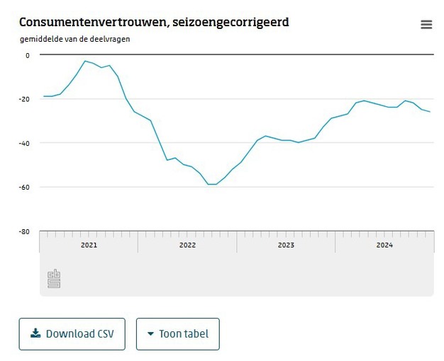 Met -26 lag het consumentenvertrouwen in december onder het gemiddelde over de afgelopen twintig jaar (-10). Het vertrouwen bereikte in januari 2000 de hoogste stand ooit (36) en in september en oktober 2022 de laagste stand ooit (-59). Het CBS meet het consumentenvertrouwen elke maand sinds april 1986 op basis van het consumentenconjunctuuronderzoek. Het consumentenvertrouwen is een gemiddelde van 5 deelvragen, waarbij van elke vraag het saldo van positieve en negatieve antwoorden wordt genomen. Als alle consumenten positief zijn, is het saldo 100. Als alle consumenten negatief zijn, is het saldo -100.