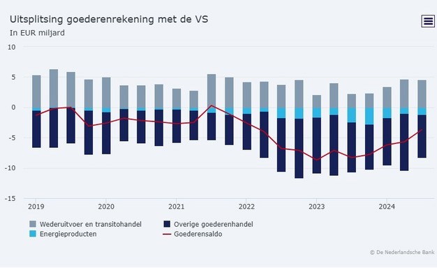 Overigens is het beeld van de goederenhandel met de VS anders dan het algehele beeld voor Nederland. In het derde kwartaal van 2024 had Nederland een overschot op de goederenrekening van € 22,3 miljard. Wereldwijd exporteren we dus meer goederen dan we importeren.