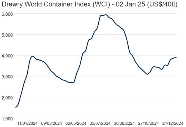 Drewry verwacht dat de tarieven op de trans-Pacifische routes de komende week verder zullen stijgen. De belangrijkste drijfveren zijn het anticiperen op de mogelijke havenstakingen van de International Longshoremen's Association (ILA) in januari 2025 en de verwachte tariefverhogingen onder de aankomende Trump-administratie.