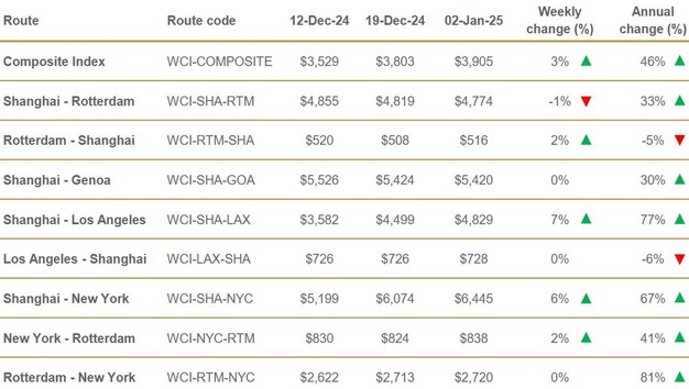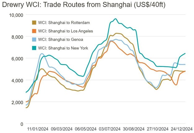 Ook op andere routes werden prijsstijgingen genoteerd. Vrachttarieven van Rotterdam naar Shanghai en van New York naar Rotterdam stegen beide met 2% naar respectievelijk $516 en $838 per container. Daarentegen daalden de tarieven van Shanghai naar Rotterdam licht met 1% ($45) tot $4.774 per container. De routes van Shanghai naar Genua, Los Angeles naar Shanghai en Rotterdam naar New York bleven stabiel.