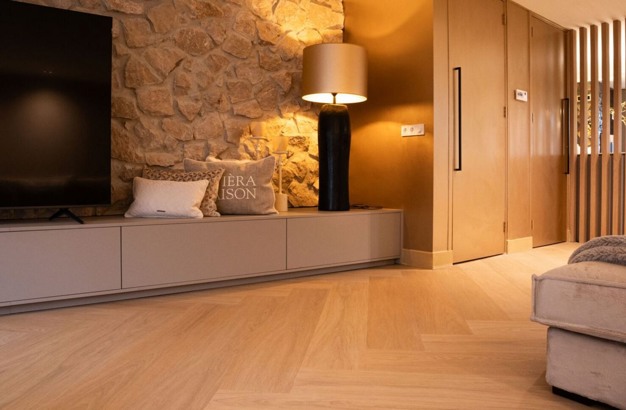 Voor het stijlvolle appartement van Debby van der Zande is in het woongedeelte gekozen voor de dinograat 7810. Deze vloer, ook bekend als onze lange plank eiken 7810, is speciaal voor dit project gelegd in een visgraatmotief. Op de bovenverdieping is de eiken 7810 gelegd in lange planken, wat zorgt voor een rustige en tijdloze uitstraling.