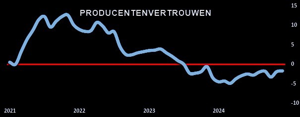 De producenten in de industrie waren in december nagenoeg even negatief als in november. Het vertrouwen ging van -1,8 in november naar -1,6 in december, aldus het CBS. Producenten waren minder pessimistisch over hun orderportefeuille. Hun oordeel over de verwachte productie in de komende drie maanden bleef even positief. Ze waren echter negatiever over de voorraden gereed product. Het volgende figuur toont de ontwikkeling van de deelindicatoren van het producentenvertrouwen.