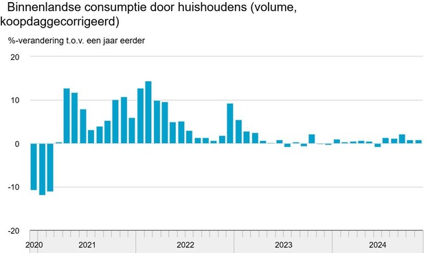 In november 2024 hebben huishoudens 0,8 procent meer geconsumeerd dan in november 2023, meldt het CBS. Ze kochten zowel meer goederen als meer diensten.
