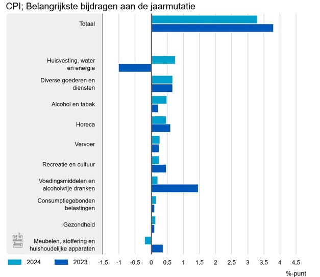 De prijzen van consumentengoederen- en diensten waren in 2024 gemiddeld 3,3 procent hoger dan in 2023, maakt het CBS bekend. In 2023 was de inflatie 3,8 procent. De inflatie wordt gemeten als de ontwikkeling van de consumentenprijsindex (CPI) ten opzichte van het voorgaande jaar. De prijsontwikkelingen van huisvesting en tabak hadden de grootste bijdrage aan de inflatie in 2024.