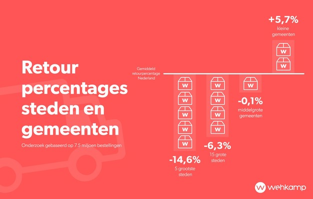 Hoe groter de stad, hoe kleiner de kans dat internetaankopen retour worden gestuurd. Dat wijst onderzoek van online warenhuis Wehkamp naar aankoop- en retourgedrag uit. Inwoners van de 5 grootste steden van Nederland sturen 14,6% minder artikelen retour dan het Nederlands gemiddelde. Inwoners van Amsterdam sturen gemiddeld de minste producten retour.