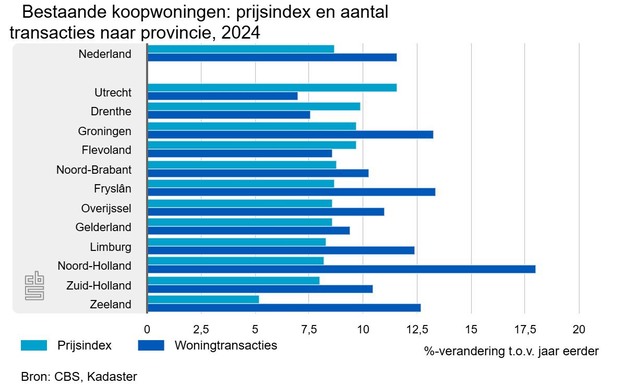 Een bestaande koopwoning was in 2024 gemiddeld 8,7 procent duurder dan in 2023. In de provincie Utrecht was de prijsstijging met 11,6 procent het grootst. Verder wisselden in Nederland 11,6 procent meer woningen van eigenaar dan in 2023. De stijging van het aantal verkochte appartementen was met 27,4 procent het grootst. Dit blijkt uit onderzoek naar de prijsontwikkeling van bestaande particuliere koopwoningen in Nederland van het CBS en het Kadaster.