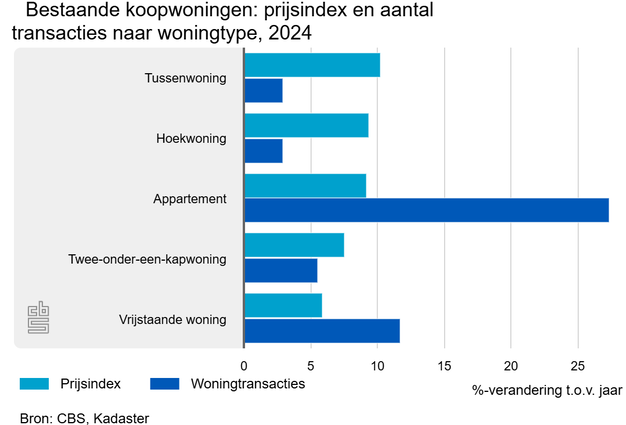 Met 27,4 procent was de stijging van het aantal transacties veruit het grootst voor appartementen. De stijging van het aantal transacties was het kleinst voor tussenwoningen en hoekwoningen (beide 3 procent). In 2023 was er bij alle woningtypen nog sprake van een daling van aantal transacties.