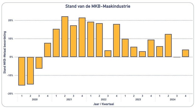 Na een teleurstellend derde kwartaal, is er in het vierde kwartaal van 2024 voor de MKB-maakindustrie sprake van slechts een heel karig herstel, voor zover er al van herstel te spreken is. Uit cijfers van de Koninklijke Metaalunie Economische Barometer blijkt dat de waardering van de huidige orderpositie positiever is dan een kwartaal eerder, net als het bedrijfsresultaat. Maar daar staat tegenover dat de orderpositie voor zowel het binnen- als buitenland in het vierde kwartaal per saldo verder is afgenomen. De verwachtingen voor het eerste kwartaal van 2025 zijn per saldo negatief, zij het dat die verwachtingen iets minder negatief zijn dan aan het einde van het derde kwartaal. De onderhouds- en servicebedrijven zijn gemiddeld genomen positiever dan de totale MKB-maakindustrie, terwijl de verspanende bedrijven en de engineering- en adviesbedrijven gemiddeld genomen negatiever zijn.