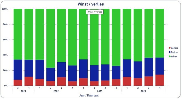 In lijn met de ontwikkeling van de orderpositie in de tweede helft van 2024 is de winstgevendheid van de MKB-maakindustrie afgenomen. Na het hoogtepunt in het tweede kwartaal van 2022, toen ruim driekwart van de bedrijven winst maakte, is dat aandeel in het derde kwartaal van 2024 teruggelopen tot 64%. Het aandeel bedrijven dat verlies maakt, is in 2024 gestaag toegenomen. Eind 2023 gaf 9% van de respondenten aan verlies te maken. Een jaar later was dit aandeel anderhalf keer zo groot, namelijk 14%. De overige 22% geeft aan quitte te draaien.
