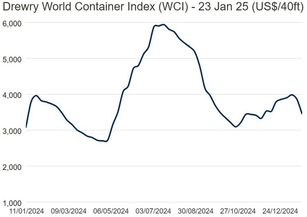 De Drewry World Container Index, een wekelijkse index die de gemiddelde spotprijzen weergeeft voor het vervoer van een 40-voets container op belangrijke mondiale zeevaartroutes, is deze week met 11% gedaald naar $3.445 per 40ft-container.