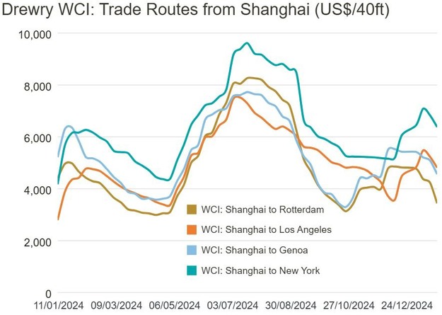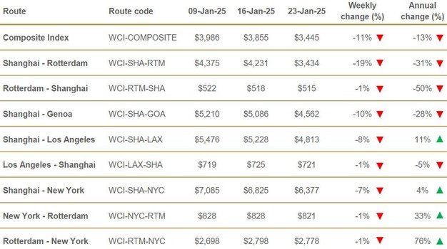 Wat betreft de specifieke vrachtprijzen: tarieven van Shanghai naar Rotterdam daalden met 19%, of $797, tot $3.434 per 40ft-container. Van Shanghai naar Genua daalden de tarieven met 10%, of $524, tot $4.562 per 40ft-container. Vrachtprijzen van Shanghai naar Los Angeles verminderden met 8%, of $415, tot $4.813 per 40ft-container, terwijl de tarieven van Shanghai naar New York daalden met 7%, of $448, tot $6.377 per 40ft-container. Ook de tarieven van Rotterdam naar Shanghai, Los Angeles naar Shanghai, New York naar Rotterdam en Rotterdam naar New York daalden met 1% tot respectievelijk $515, $721, $821 en $2.778 per 40ft-container.
