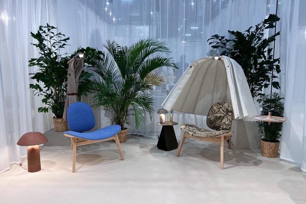 Quentin Taymans en Diego Libbrecht van Inner Design, poserend bij hun nieuwste creaties op Maison & Objet waarvan Wonen360 onlangs verslag deed.