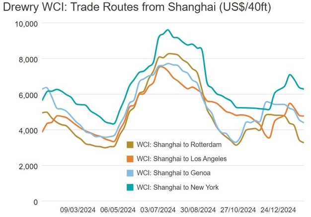 - Shanghai – New York: 1% daling naar $6.288 per 40ft container.