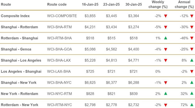 - Shanghai – Rotterdam: 5% daling (-$160) naar $3.274 per 40ft container.