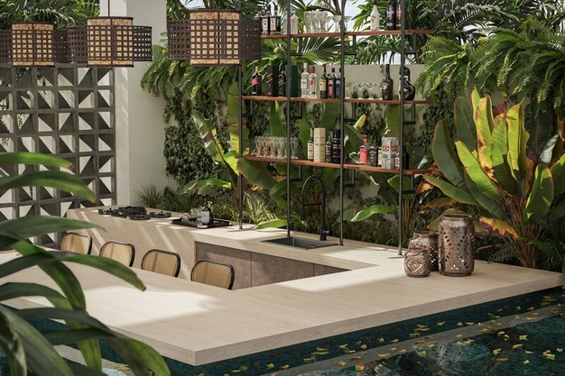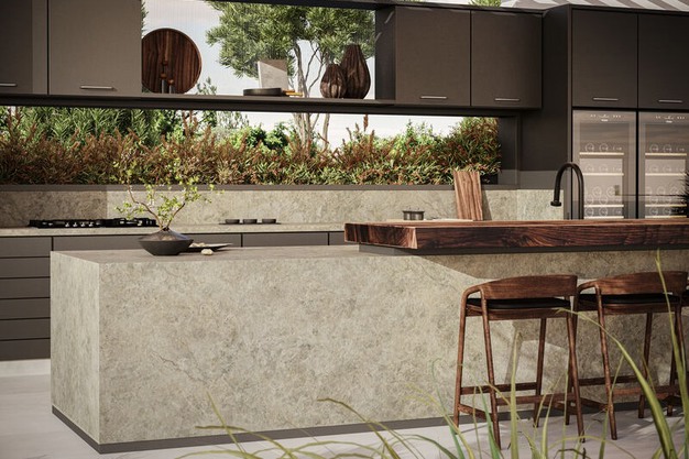 "Biophilisch ontwerp richt zich op het verbinden van mensen met de natuur in hun leefomgeving. Het woord 'biophilisch' komt van het Griekse 'bios' (leven) en 'philia' (liefde voor), wat betekent 'liefde voor het leven'. Dit ontwerpconcept draagt bij aan het welzijn en de gezondheid van mensen. In 2025 ligt de focus op aardse groentinten gecombineerd met materialen als hout, steen en geweven structuren. Deze combinatie creëert een rustige en uitnodigende sfeer. Caesarstone's 542 Mosstone past perfect binnen dit concept met een saliegroene basis, met mosachtige accenten en subtiele roesttinten die doen denken aan verweerd natuursteen.