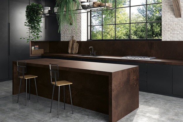 Caesarstone speelt in op deze trend met oppervlakken zoals de robuuste uitstraling van 303 Metallio Brown. De warme roesttinten en ruwe textuur geven het een handgemaakte uitstraling die perfect aansluit bij de focus op eenvoud en authentiek vakmanschap in het keukendesign van 2025."