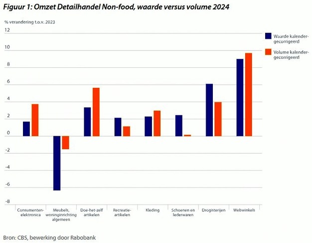 Uit de voorlopige cijfers van het Centraal Bureau voor de Statistiek (CBS) blijkt dat de detailhandel in 2024 een omzetgroei van 2,6% en een volumestijging van 1,3% kende ten opzichte van 2023. Vooral non-food retailers droegen bij aan deze groei, met een omzetplus van 3,9% en een volumestijging van 4,3%. Toch presteerde de interieurbranche minder goed: de omzet in meubels en woninginrichting daalde met 6,3%, terwijl het verkoopvolume met 1,5% afnam.