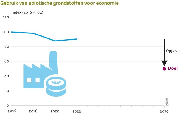 Het lukt Nederland nog niet om de hoeveelheid grondstoffen die we gebruiken fors terug te dringen. We hebben als land afgesproken dat we daaraan werken, met als doel om in 2030 de helft minder fossiele, minerale en metalen grondstoffen te gebruiken. In 2050 zou de economie van Nederland helemaal circulair moeten zijn. We gebruiken dan minder grondstoffen voor spullen, of de spullen zijn van duurzamer materiaal gemaakt. We gebruiken spullen langer. En we zorgen dat alle grondstoffen, zoals metalen of mineralen, steeds opnieuw worden gebruikt zodat ze in de economie en in het land blijven. Dat meldt het Planbureau voor de Leefomgeving (PBL).