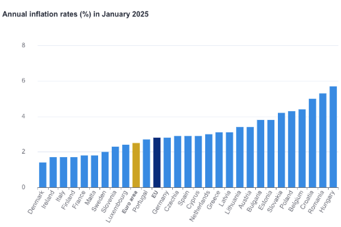 De inflatie in de eurozone bedroeg in januari 2025 2,5% op jaarbasis, tegen 2,4% in december 2024. Een jaar eerder was dit nog 2,8%. De inflatie op jaarbasis in de Europese Unie was 2,8% in januari 2025, tegen 2,7% in december 2024. Een jaar eerder was dit 3,1%. Deze cijfers worden gepubliceerd door Eurostat, het bureau voor de statistiek van de Europese Unie.