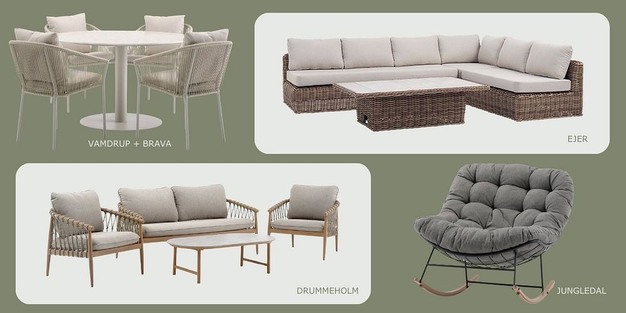 Geweven en gevlochten details komen ook nadrukkelijk voor in de collectie van 2025. Loungesets zoals de DRUMMEHOLM en STOVNER zorgen voor een lichte en luchtige uitstraling. Een absolute blikvanger is de nieuwe loungeset EJER, met een in hoogte verstelbare tafel met keramieken blad – perfect om te schakelen tussen dineren en relaxen.