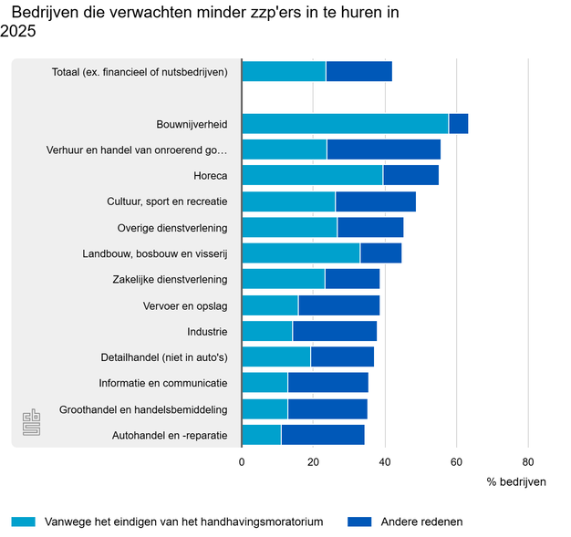 In de bouwnijverheid verwachten ruim 6 op de 10 bedrijven minder zzp'ers in te huren. En bijna alle bedrijven geven aan dit komt door het eindigen van het handhavingsmoratorium. Ook in de horeca en landbouw is dit de belangrijkste reden om minder zzp'ers in te zetten. In de autohandel, de informatie en communicatie en de groothandel verwachten relatief weinig bedrijven een afname van zzp'ers (ongeveer 35 procent). In deze bedrijfstakken wordt het einde van het handhavingsmoratorium ook minder vaak als reden genoemd.