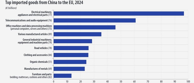 Naast meubels werden vooral elektrische machines, apparaten en onderdelen daarvan (ter waarde van €96,8 miljard) geïmporteerd uit China. Ook telecommunicatie- en audioapparatuur (€60,9 miljard) en kantoormachines en dataverwerkingsmachines, zoals persoonlijke computers, servers en andere (€45,9 miljard), werden in grote hoeveelheden geïmporteerd.