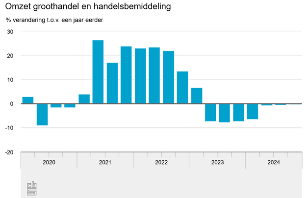 Met het vierde kwartaal is ook het jaarcijfer beschikbaar. In 2024 daalde de omzet van de groothandel met 2,0 procent ten opzichte van 2023. De groothandel in voedingsmiddelen was de enige sector die een omzetstijging liet zien, met een toename van 5,3 procent ten opzichte van 2023. In alle andere groothandelsbranches daalde de omzet of bleef deze gelijk vergeleken met 2023.
