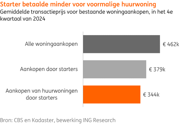 Mede doordat beleggers nu steeds vaker huurwoningen van de hand doen, slagen starters met middeninkomens nu beter in het aankopen van een woning. Van de woningen die investeerders in het 4e kwartaal van 2024 verkochten aan huishoudens die er zelf gaan wonen, was 65% een koopstarter. Voor deze voormalige huurwoningen betaalden starters eind vorig jaar gemiddeld zo'n €344.000. Dat is minder dan de gemiddelde prijs van €379.000 die starters voor alle hun woningaankopen neerlegden. Dat investeerders deze woningen tegen lagere prijzen verkochten, wordt voornamelijk verklaard doordat het volgens de NVM relatief vaak kleinere appartementen zijn.