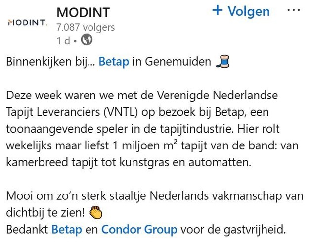 Verenigde Nederlandse Tapijt Leveranciers op bezoek bij Betap