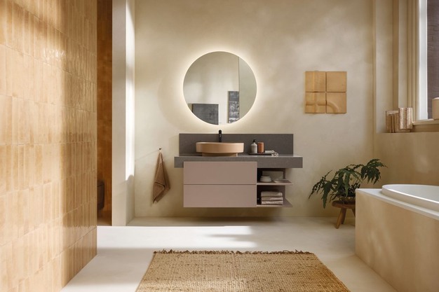 De badkamermeubels hebben een natuurlijk, door de natuur geïnspireerd kleurenpalet met tinten variërend van wit en aardse bruintinten tot antraciet. Speelse accenten worden gecreëerd door de gestructureerde oppervlakken. Als extra optie zijn er minerale wastafelbladen beschikbaar in drie tinten, wat extra diepte en authenticiteit aan het ontwerp geeft.