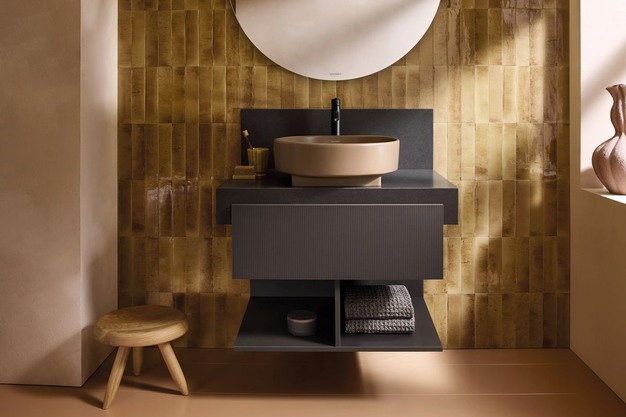 De opzetwastafels fungeren als sculpturale blikvangers en gaan verder dan alleen hun functionele rol. Urquiola gaf de wastafels een architecturale uitstraling door ronde en ovale kommen op een vierkante basis te plaatsen. Dit spel van niveaus loopt als een rode draad door de hele collectie – van de wandwastafels en toiletten tot de meubels en baden.